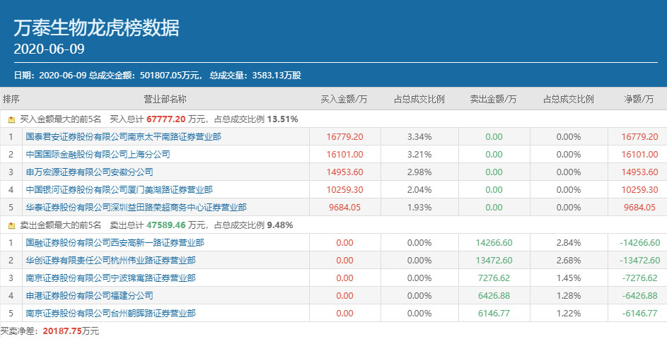 6月9日,万泰生物(603392.SH)终于结束了上市以后连续一字板的状态,最终收涨6.15%。当日公布的龙虎榜数据显示,知名游资作手新一的常用席位国泰君安证券南京太平南路以高达16779.19万元的买入额高居该股买方榜首。