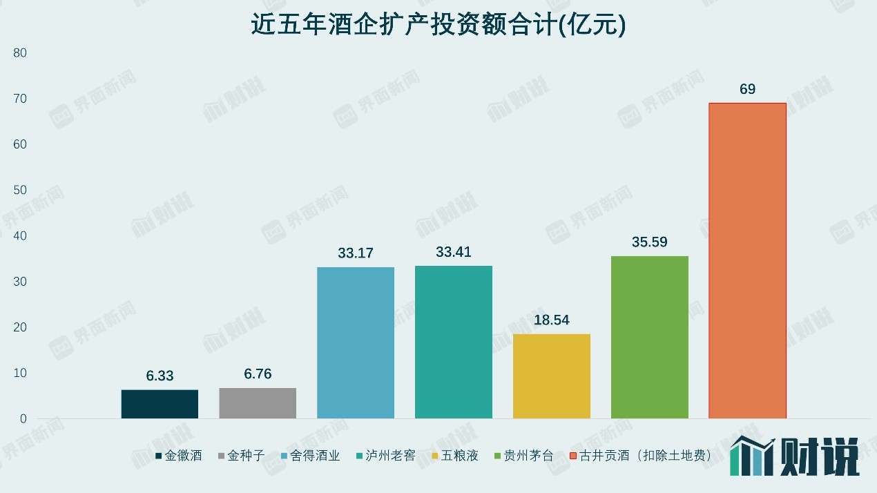 即便是按照扣除土地费用后的估算,古井贡酒本次投资额也是酒企近五年之最。同为四、五线城市,新余市奉渝产业园占1000亩,总投资约10亿;泉州南安市高端装备智造标准厂房项目占地2000亩,总投资约15亿;以此估算,古井贡酒1830亩产业用地预计投资额在15亿至20亿之间。因此,古井贡酒扩产建设净投资预计在69亿至74亿之间。