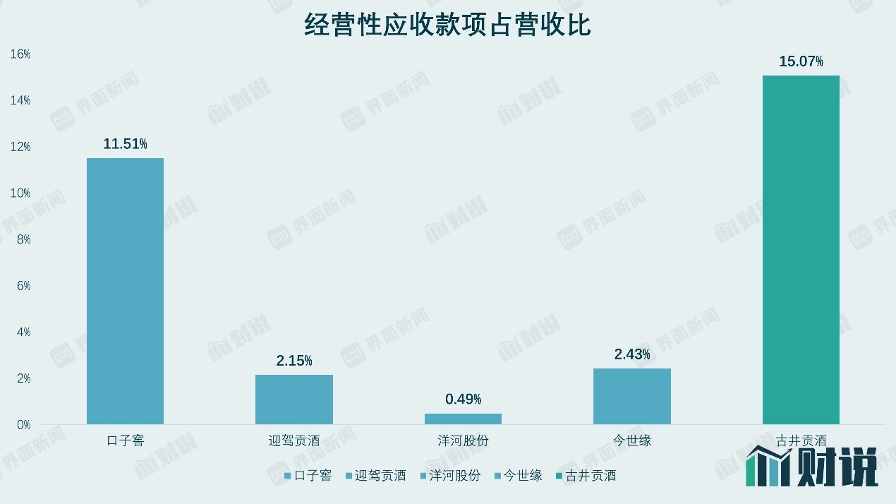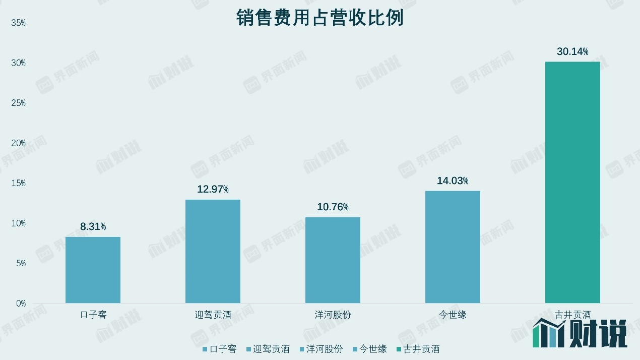 古井贡酒的销售费用占营收比例,放眼酒企都是遥遥领先。界面新闻统计各酒企最新财报发现,古井贡酒销售费用占比常年保持在30%左右,相较行业内多数酒企的10%至15%,高出一倍,显得格外刺眼。