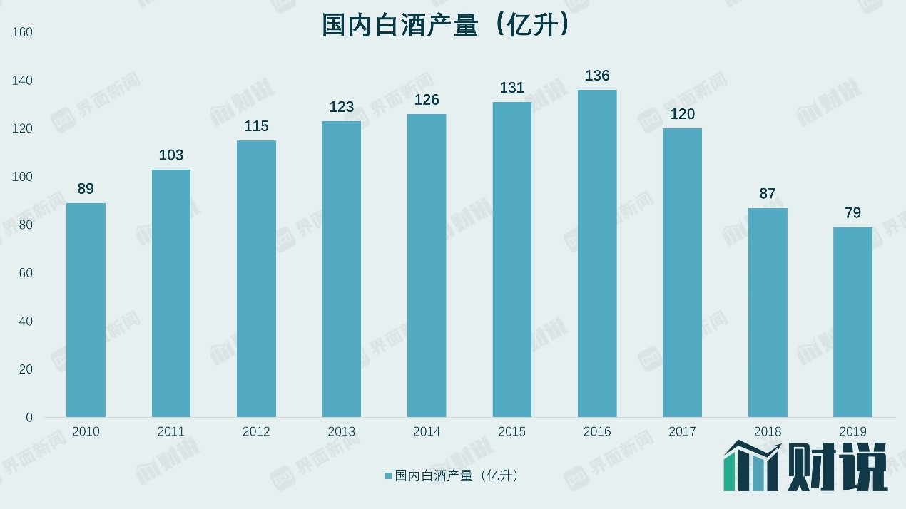 近十年来,白酒行业产量处于“A”字形状态。根据万得统计,2018年我国白酒产量为87亿升,对比2010年的89亿升,白酒产量十年在走了一个“A”形后又重新回到原点。2019年白酒产量继续走低,相较2018年又下滑9.2%至79亿升。