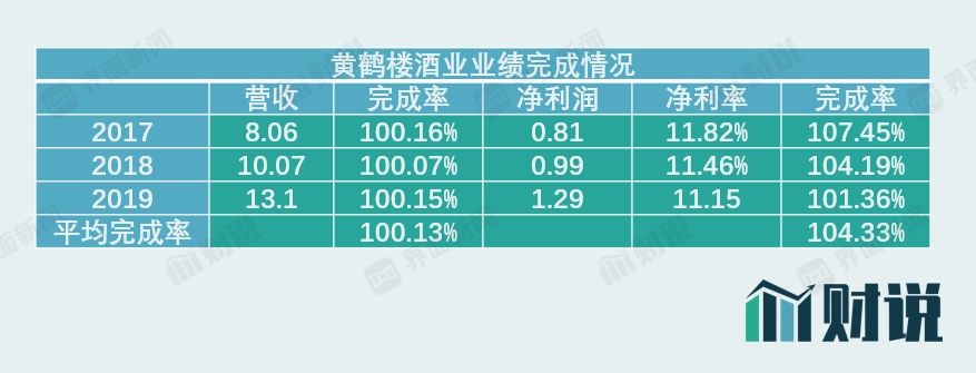 2017年黄鹤楼酒业营收8.06亿元,净利润0.81亿元,净利率11.82%,两项指标(营收及净利率)完成率分别为100.16%和107.45%。2018年黄鹤楼酒业营收10.07亿元,净利润0.99亿元,净利率11.46%,两项指标完成率分别为100.07%和104.19%。2019年黄鹤楼酒业营收13.1亿元,净利润1.29亿元,净利率11.15%,两项指标完成率分别为100.15%和101.36%。三年间黄鹤楼酒业营收指标和净利率的平均完成率分别为100.13%和104.33%,惊险达标。