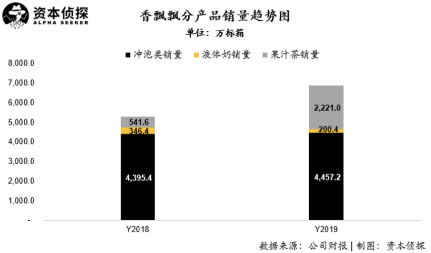 在销量上,冲泡类产品依然是最主要的收入来源,在2019年销售了4457.2万标箱,占总销量超过一半。即饮类产品销量在2019年贡献了主要的销量增长,尤其是果汁茶类饮品。香飘飘果汁茶2019年全年销售2221万标箱,同比增长超过310%,且在产品销量权重上持续提升。