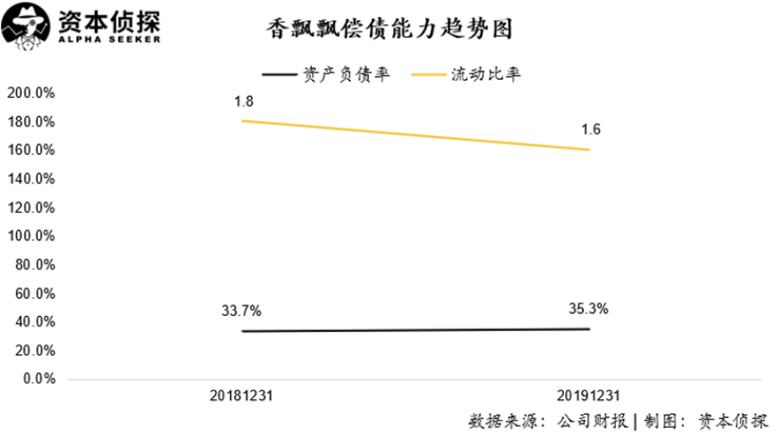 债务方面,香飘飘2019年末的资产负债率仅为35.3%,流动比率为1.6。作为一家需要投入大量固定资产的生产型企业来说,香飘飘整体偿债风险较低。