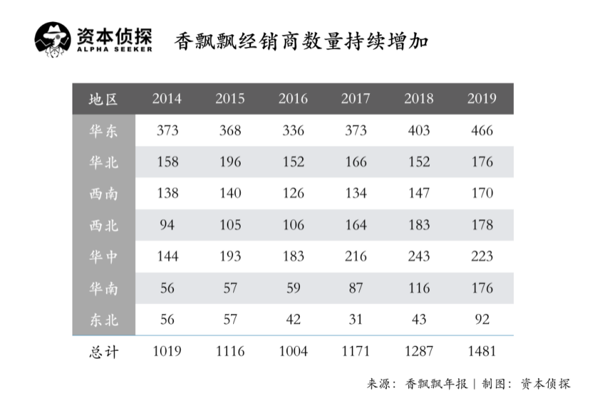 线下方面,香飘飘继续推动“县域市场渗透+城市势能打造”的策略,建立基本覆盖国内大中型城市及县区的全国性销售网络,进一步提高市场渗透率。香飘飘的经销商数量正在持续增加,区域结构也日益优化。
