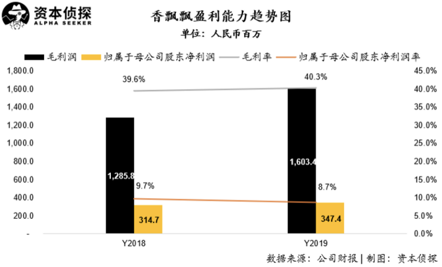 另一方面,香飘飘在2019年研发费用为3100万元人民币,较2018年增长251.1%,这主要是由于公司对新产品研发投入更多资源,因此导致研发费用提升。
