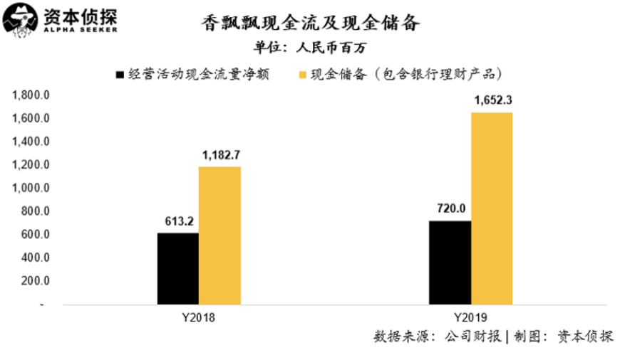 而在现金方面,香飘飘2019年经营活动现金净流入7.2亿元人民币,同比增长17.4%;公司年末现金储备也达到了历史新高的16.52亿元,远高于18年末的11.83亿元。
