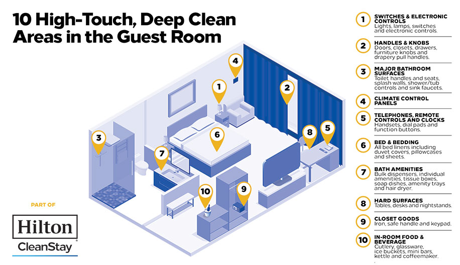 希尔顿的清洁计划被命名为 Hilton CleanStay,这是希尔顿与清洁剂品牌 Lysol、世界最著名的医疗机构之一的 Mayo Clinic 合作的成果。希尔顿宣称这是一个严格的系统,受到来自 Mayo Clinic 感染预防和控制小组的专家将提供建议和协助,共同制定的清洁和消毒规程。