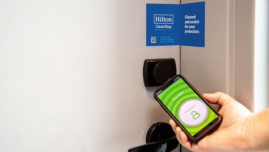非接触式入住:鼓励客人使用希尔顿荣誉客选择客房,并使用数字房钥匙移动入住与退房