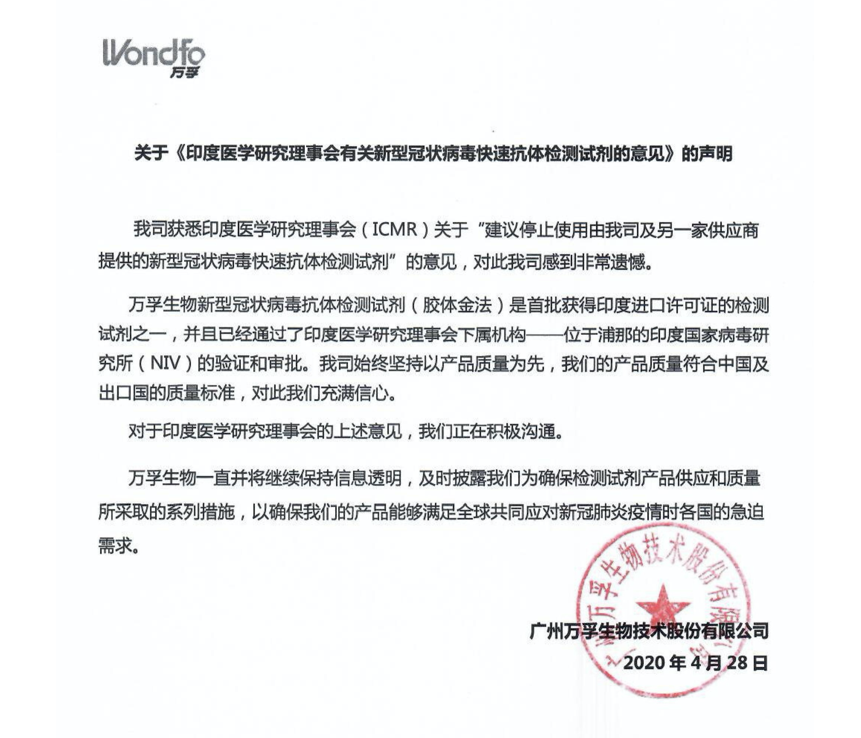 我们注意到,中国广州万孚生物技术股份有限公司和珠海丽珠试剂股份有限公司已就此发表声明,强调其生产的新冠病毒抗体快速检测试剂盒均已通过中国药监局审批,符合质量标准要求,也通过了印度医学研究理事会下属机构印度国家病毒研究所的验证,并被认为是满意的产品。上述公司生产的检测试剂向欧洲、亚洲、拉美等地区多个国家出口并获得了积极评价。