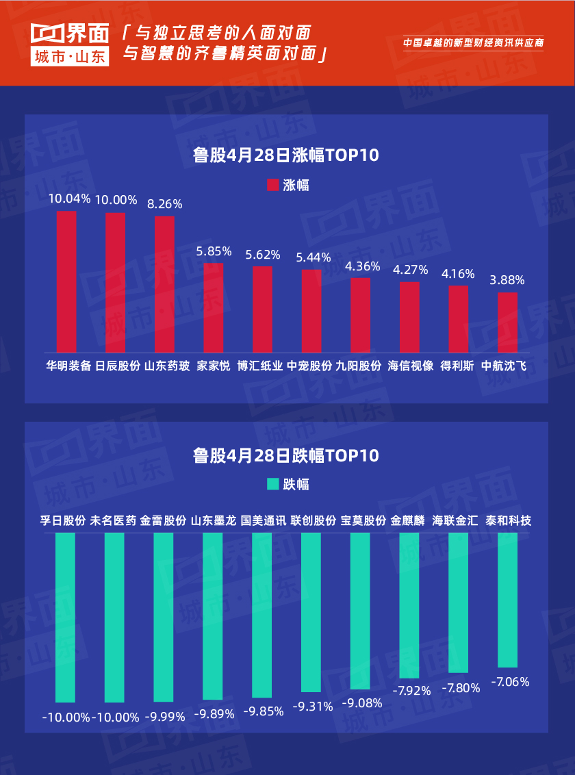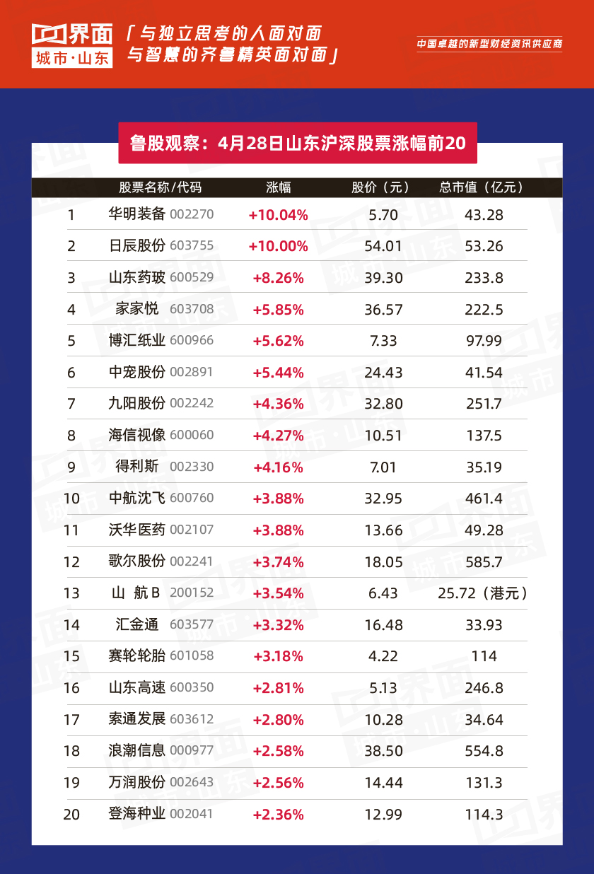 4月28日,山东省内沪深股票有51只个股上涨,157只下跌,1只与上一个交易日收盘价持平;