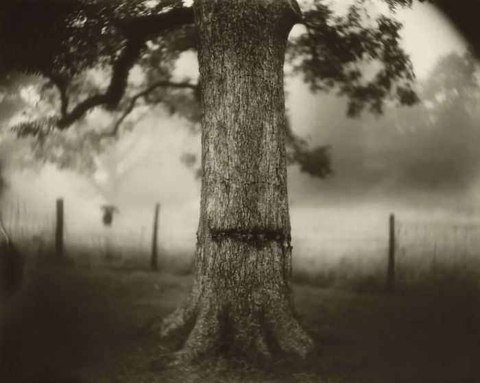 不太清楚的是,曼在开始拍摄她的家乡弗吉尼亚州的风景时,以及在接受亚特兰大艺术博物馆的委托,参与《南方图景》系列的拍摄时,是否就已经决定这些充满神秘光晕的影像讨论的是种族问题的遗存,还是这种历史意识在半道上如天启一样降临。无论如何,一九九八年,还清了农场的贷款之后,她就开着越野车启动了首次南下阿拉巴马州、密西西比州和路易斯安那州的旅程。曼描述了旅行中偶遇的许多陌生人的善意:陌生的夫妇邀请她去住自己的别墅,擅入私人领地却获得主人的帮助,等等。与她记录的陌生人的热情好客截然相反的是她镜头中的南方风景:被废弃的种植园;在朦胧的背景前,画面主体是一棵树干,上面有一道深深的划痕,仿佛渗着血的伤口;紧贴地面的扭曲纠缠的树根周围雾气氤氲,如同沼泽中匍匐的骷髅……这些照片让我们仿佛置身于经典的美式恐怖片里,背后发凉,回头却不见人影。“南方就是由如此的矛盾与并置所造就:它失落世界的优雅光彩是建筑在暴行之上的。”(第225页)曼如此写道。