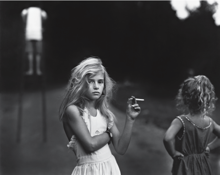 有时曼也会展示可以被形容为“恬静”的照片,比如将两条辫子盘起的杰西面对树林和水潭,将赤裸的完美的背部留给镜头。更多的时候,他们将犀利的眼神投向照片之外——埃米特在齐腰的水中,照片似乎捕捉到他走向深处之前回望的瞬间(当然,这是几乎一个星期反复拍摄的成果);弗吉尼娅准备跳入水中,湿漉漉的头发紧贴着她的肋骨散开(这一照片也拍了许多次)……这两张照片都是微微俯拍的视角,两个孩子都抬起头望向镜头,这种凝视让我们不自在,似乎他们提出了什么成年人无法回答的问题,或许这也是为什么会有读者给曼写信,认为让人不安的不是儿童的裸体,而是他们的表情。“曼向我们展示的这些孩子,血管里一定流淌着冰;她的孩子们让我毛骨悚然。”一封读者来信如此写道。曼在自述中回应说:“照片中的人并不是我的孩子们;他们是从时间里偷出来的、被显像在银色照相纸上的人物……他们是存在于影像里的孩子。”(第149页)