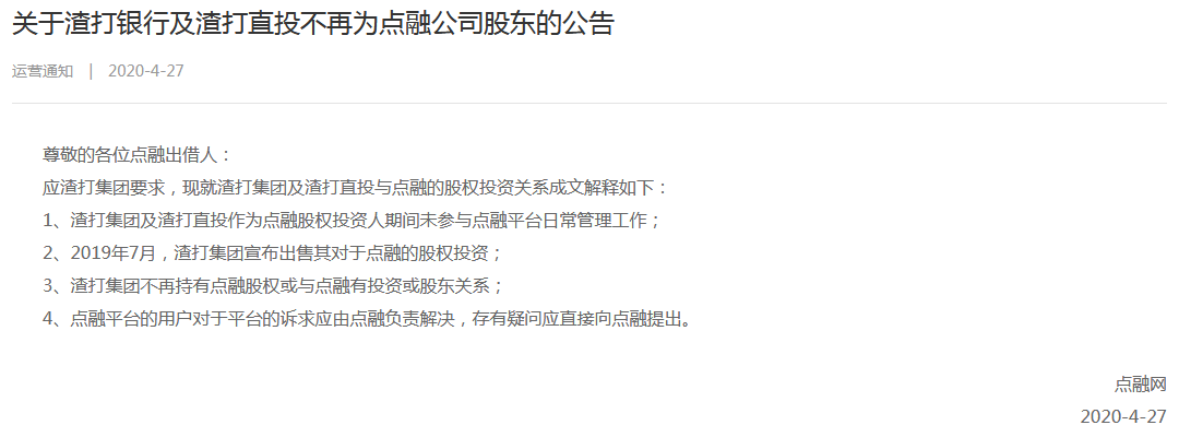 该公告称,2019年7月,渣打集团宣布出售其对于点融的股权投资,渣打集团不再持有点融股权或与点融有投资或股东关系,渣打集团及渣打直投作为点融股权投资人期间未参与点融平台日常管理工作,点融平台的用户对于平台的诉求应由点融负责解决,存有疑问应直接向点融提出。