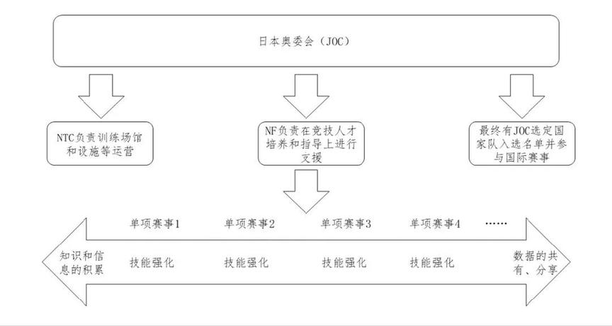 一为竞技体育。日本竞技体育发展依靠中央层的文部省下属体育厅,社会层的国家奥委会(JOC)、中央竞技团体(NF)和国家训练营(NTC)(具体运营方式如图8所示)以及地方层的各都道府县及其体育协会各司其职地完成工作。