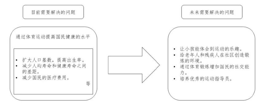 二为群众体育。根据日本体育厅于2015年12月发布的《体育行政的现状》指出:推动群众体育发展的目标应是使全国各地居民可以随时随地参与到体育运动当中,并在人口老龄化和少子化的压力下保障和促进居民的健康,从而达到体育运动能贴近人们的生活、延长居民的寿命和减少医疗费用支出的目标。为此,日本体育厅明确了当前和未来需要解决的问题(图10),日本文部科学省则采取了在各个社区创立综合型社区体育俱乐部的方式。