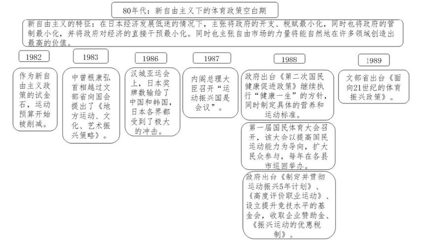 三是新自由主义下的体育政策空白期。八十年代是日本“缺乏体育政策的时期”,其特点就是没有明确的体育政策,主要由“新自由主义的福利体制改革”而导致:由于八十年代经济增长下行和政府财政吃紧等原因,日本政府的福利政策由“福利主义”转变为“新自由主义式日本型福利社会”,于是从1982年起日本开始削减相关体育财政预算,作为新福利政策推行的试金石。