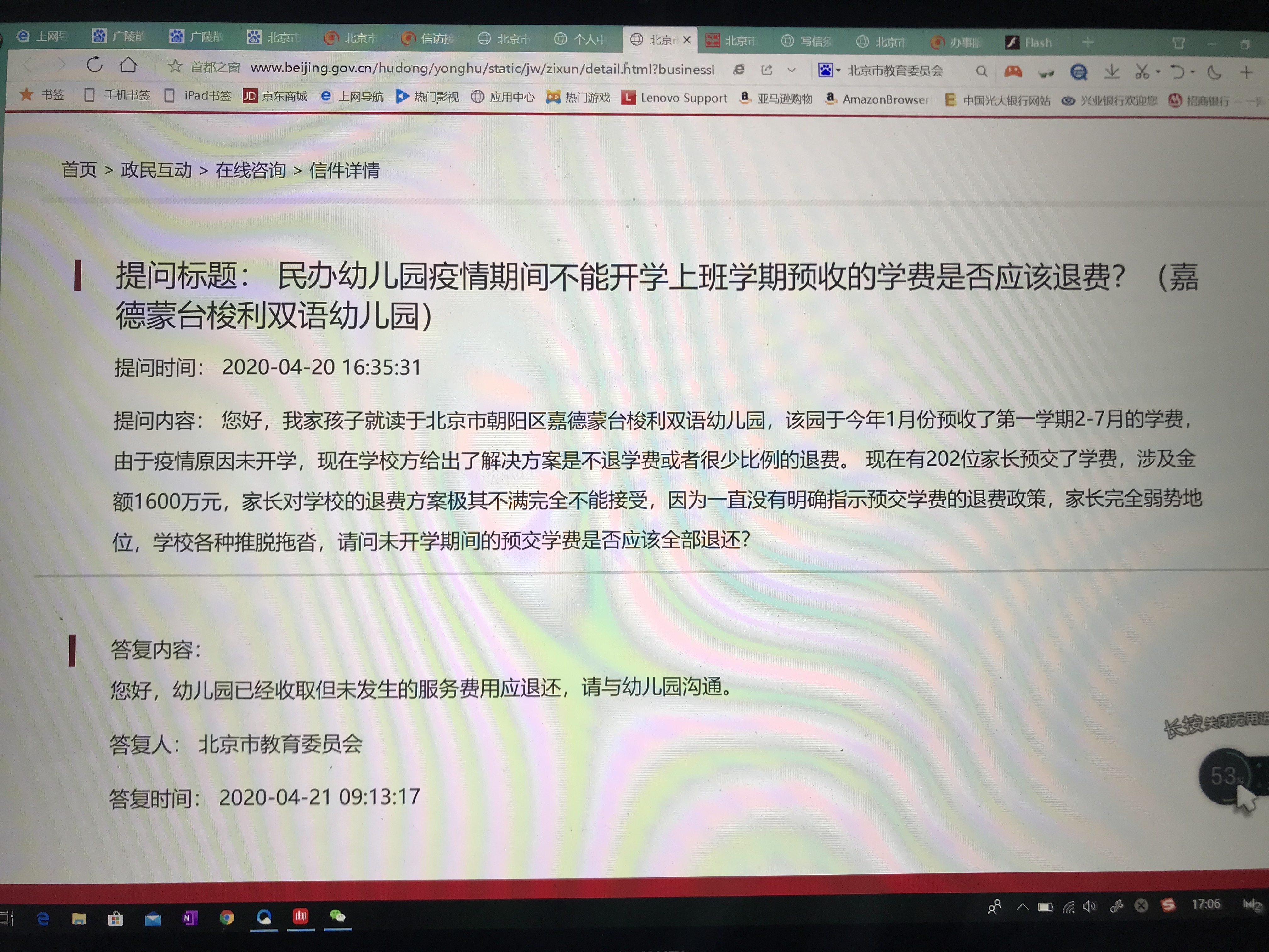一位家长向政府网站上向北京市教委咨询退费意见,北京市教委回应称:“幼儿园已经收取但未发生的服务费用退还,请与幼儿园沟通。”然而,截至目前,嘉德幼儿园仍未拿出让家长们认同的退费方案。