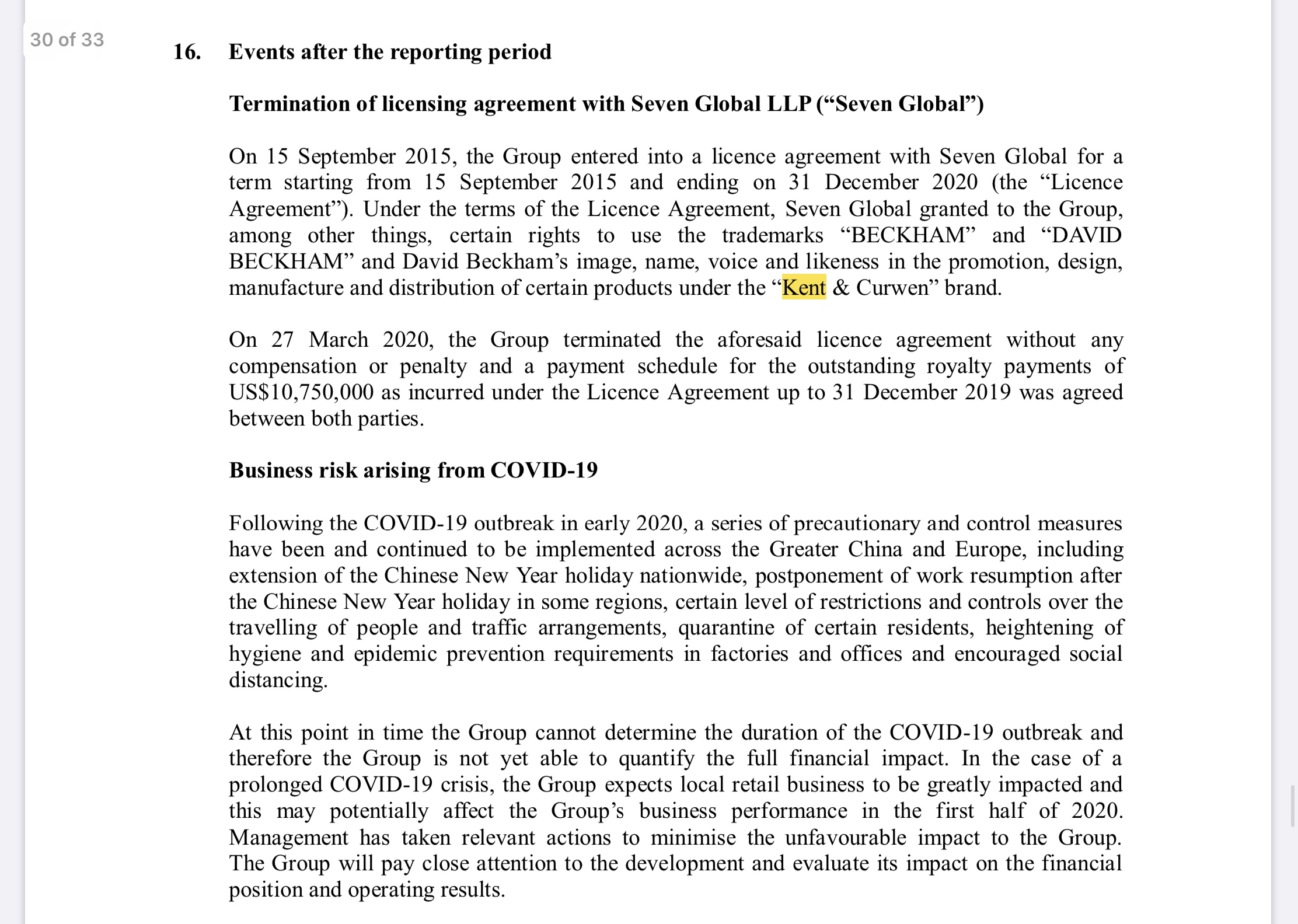 根据利邦集团2019年财报,该公司与一家名为“Seven Global”的企业在2020年3月27日终止了一份授权协议,而“Seven Global”正是大卫·贝克汉姆的公司。这份授权协议与2015年5月签署,合约期终止于2019年12月31日。