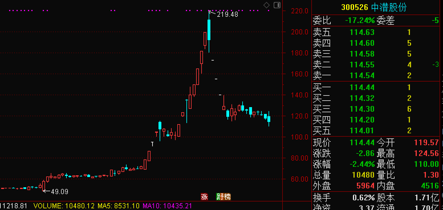 不过,自4月3日中潜股份创出历史高位219.48元之后,股票便出现掉头,趋势一坏便接连出现数个“一字跌停”,股价迅速回落到120元一线。截至目前,中潜股份的股价仍在这一带徘徊,看其每天1%不到的换手率,直令人大气不敢出喘一口。