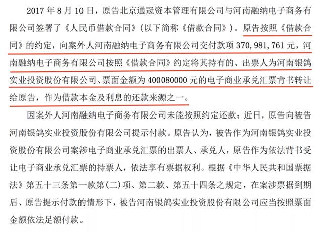 起诉原因是,通冠资本向河南融纳电子商务有限公司(以下简称“河南融纳)借款3.71亿元,河南融纳按照约定将其持有的出票人为银鸽投资、票面金额为4.0008亿元的电子商业承兑汇票背书转让给了通冠资本。
