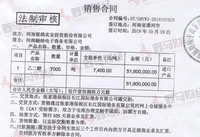 2018年10月19日,银鸽投资与河南融纳签订了两份乙二醇销售合同,合计数量16000吨,单价分别为7400元/吨、7250元/吨。交货地点为“张家港长江国际港务有限公司罐交割”,交货方式为“张家港长江国际网上仓储服务平台交给需方,办理交割手续后需方自提”,结算方式为“预付105天(150天)商业承兑汇票”。