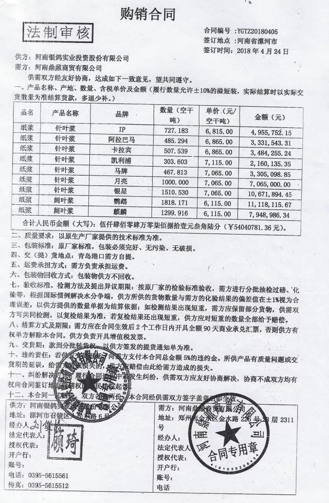 此外,河南融纳在2017年6月14日变更其经营范围,增加了“纸浆、木浆”等。次年,就与银鸽投资开展了纸浆销售的交易行为。