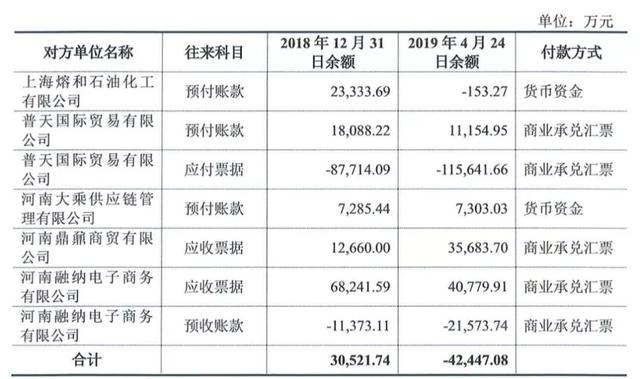 在这一表格中,上海熔和石油化工有限公司(下称“上海熔和”)、普天国际贸易有限公司(下称“普天国际”,为国企)、河南大乘供应链管理有限公司(下称“河南大乘”)为银鸽投资的供货方,河南鼎鼐商贸有限公司(下称“河南鼎鼐”)、河南融纳电子商务有限公司(下称“河南融纳”)均为其客户,交易有来有往。