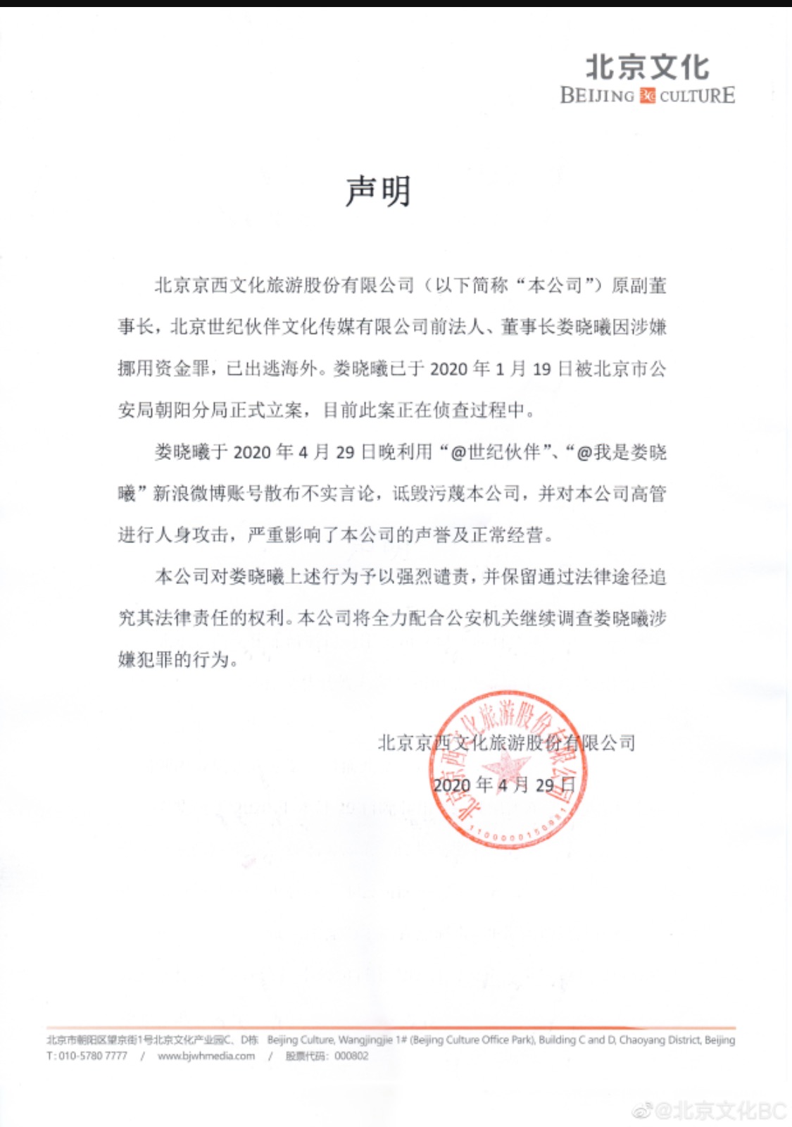 该声明同时也挂在了认证信息为“北京京西文化旅游股份有限公司”的“北京文化BC”官方微博上。