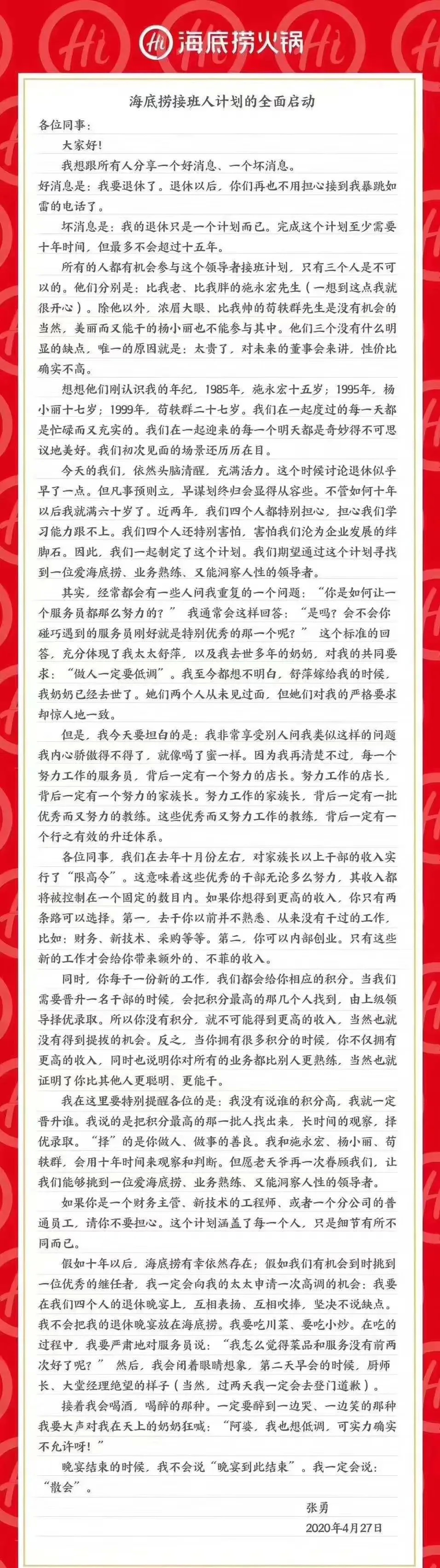 由此看来,未来十年,海底捞任重而道远,这个长达十年的接班人计划显得尤为重要。