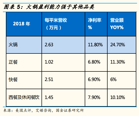 根据国家统计局的数据,2018年中国餐饮业零售总额同比增长10%,达到4.3万亿元。而根据欧睿国际的数据,2018年主要火锅企业占整个餐饮业的份额为15.4%,2018-2022年预测的收入复合年增长率为10.2%,高于其他中餐板块。