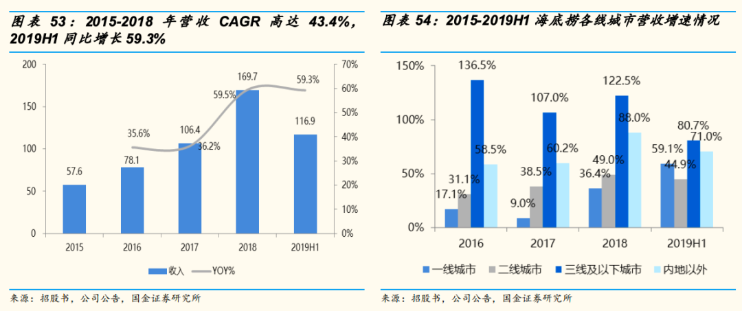 因此,海底捞正在重点布局下沉市场,三线及以下城市2015-2018年营收占比由5.5%提升15个百分点至20.5%,2019年达到22.3%。