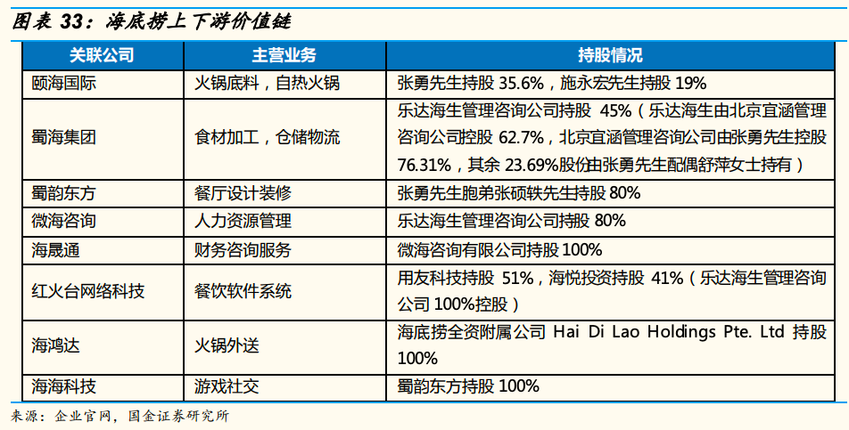 目前,海底捞集团关联公司主要涵盖底料供应、原材料采购、仓储物流、公司财务及人力资源管理、广告营销设计等环节,形成了较深的产业链壁垒,为集团长期发展提供基础。