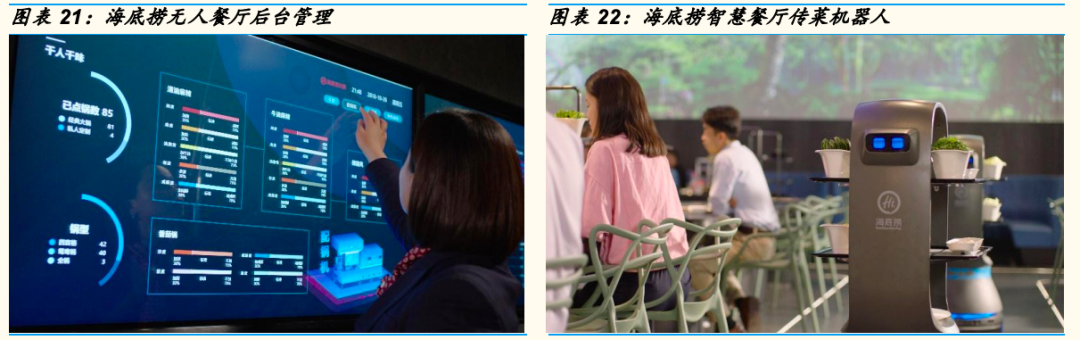 在2019年,公司开了3家海底捞智慧餐厅,对传菜、配菜、配锅、后厨等实施深度自动化作业。人工成本为餐饮领域费用的第一大项(海底捞人工成本2019年占比30.1%),且在后续仍呈持续上涨趋势。