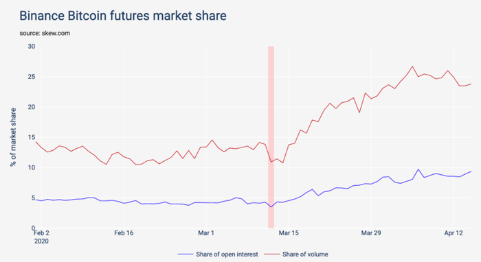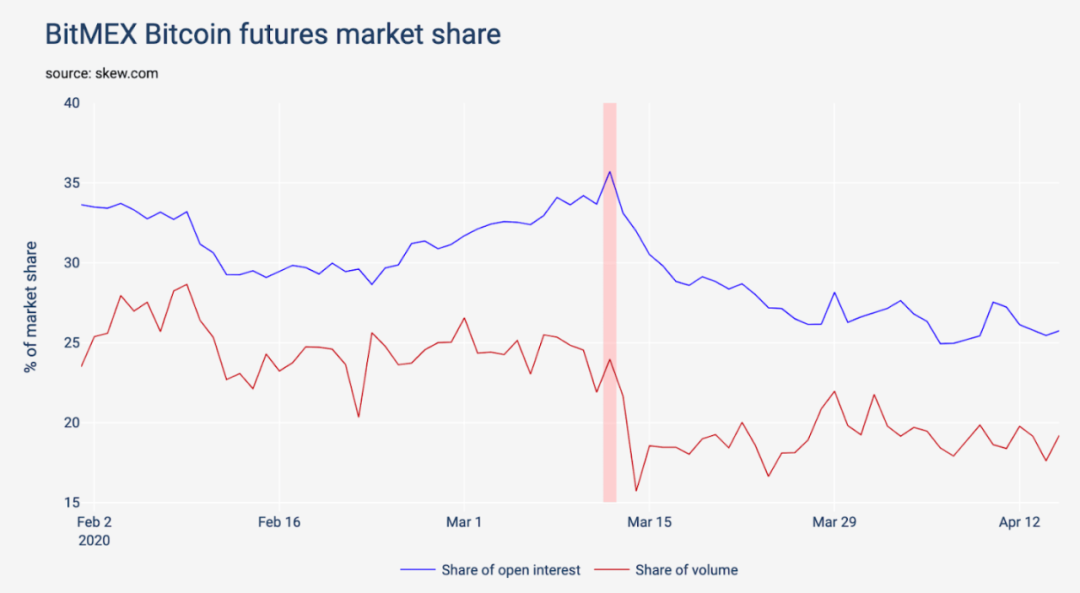 黑天鹅事件前后bitmex、币安市场份额变化 数据来源:The skews