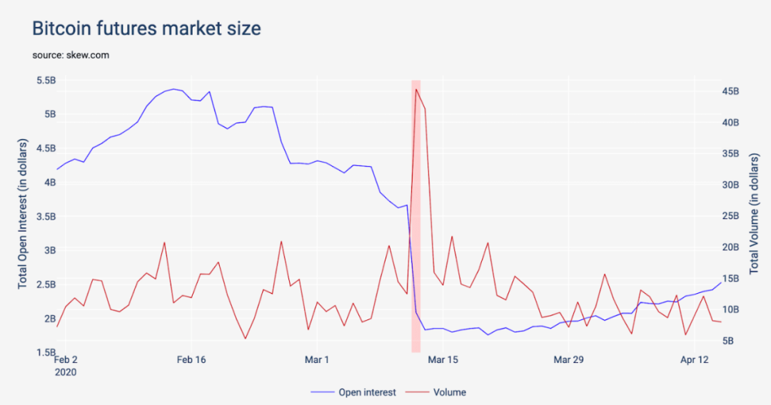 在今年的减半行情的预期下,投资者纷纷押注比特币后市。根据Skew的数据,OKEx、BitMEX、Huobi和Binance这四个主要的合约交易所的在3月9日的单日总交易量就达到了271.6亿美元,相较于一个月前增长了40%,行情似乎火爆了起来。