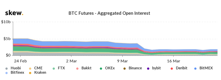 根据Skew的数据,从3月11日到3月14日,BitMEX的未平仓合约(OI)从12亿美元急剧下降到5.93亿美元,这意味着三天内的跌幅约为50%;OKEx也难逃相同命运,从8.88亿美元降至4.88亿美元,降幅也接近50%。