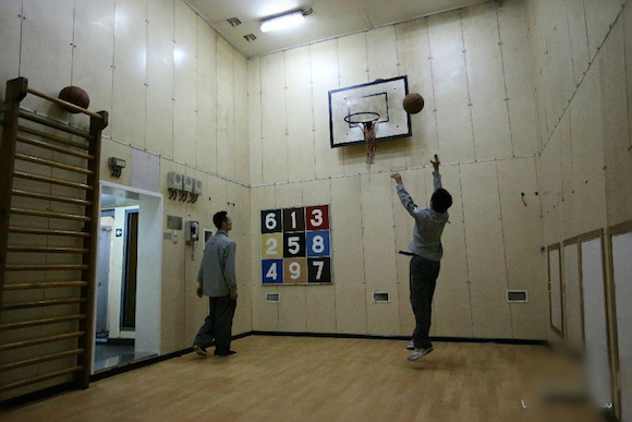 11月8日,科考队员在“雪龙”号里的篮球场打球。