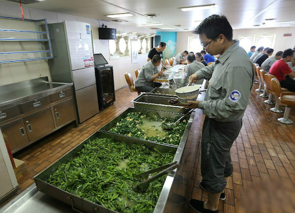 11月8日,科考队员在“雪龙”号的餐厅里就餐。