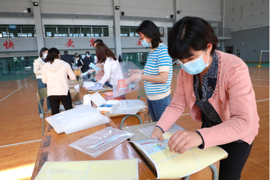 4月29日上午,浙江工商职业技术学院体育馆内,数排课桌分组摆放,20多位教工党员分工合作,忙着分装体温表、口罩、返校复学防疫指导手册等物资,一个个防疫健康包经过他们的手打包完毕码放整齐。