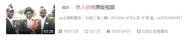 “黑人抬棺”的用法就更加脱离“死亡本身”了。从存在方式和传播路径来看,“黑人抬棺”的定位实际上更接近王司徒、金坷垃、葛炮,是一种网民共同参与的二次创作热潮,与之类似的还有在2019年开始流行的“唢呐”,按照B站最早的内容分类习惯可以统称为“鬼畜”。
