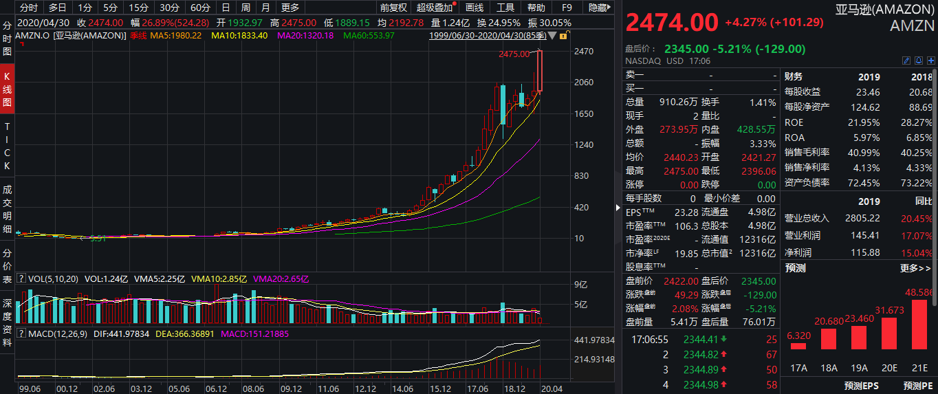 亚马逊第一季度净销售额755亿美元,同比增加26%,市场预估737.4亿美元;第一季度AWS净销售额102.2亿美元,季环比增加2.7%;第一季度每股收益5.01美元,市场预估6.27美元;预计第二季度净销售额750亿美元至810亿美元。