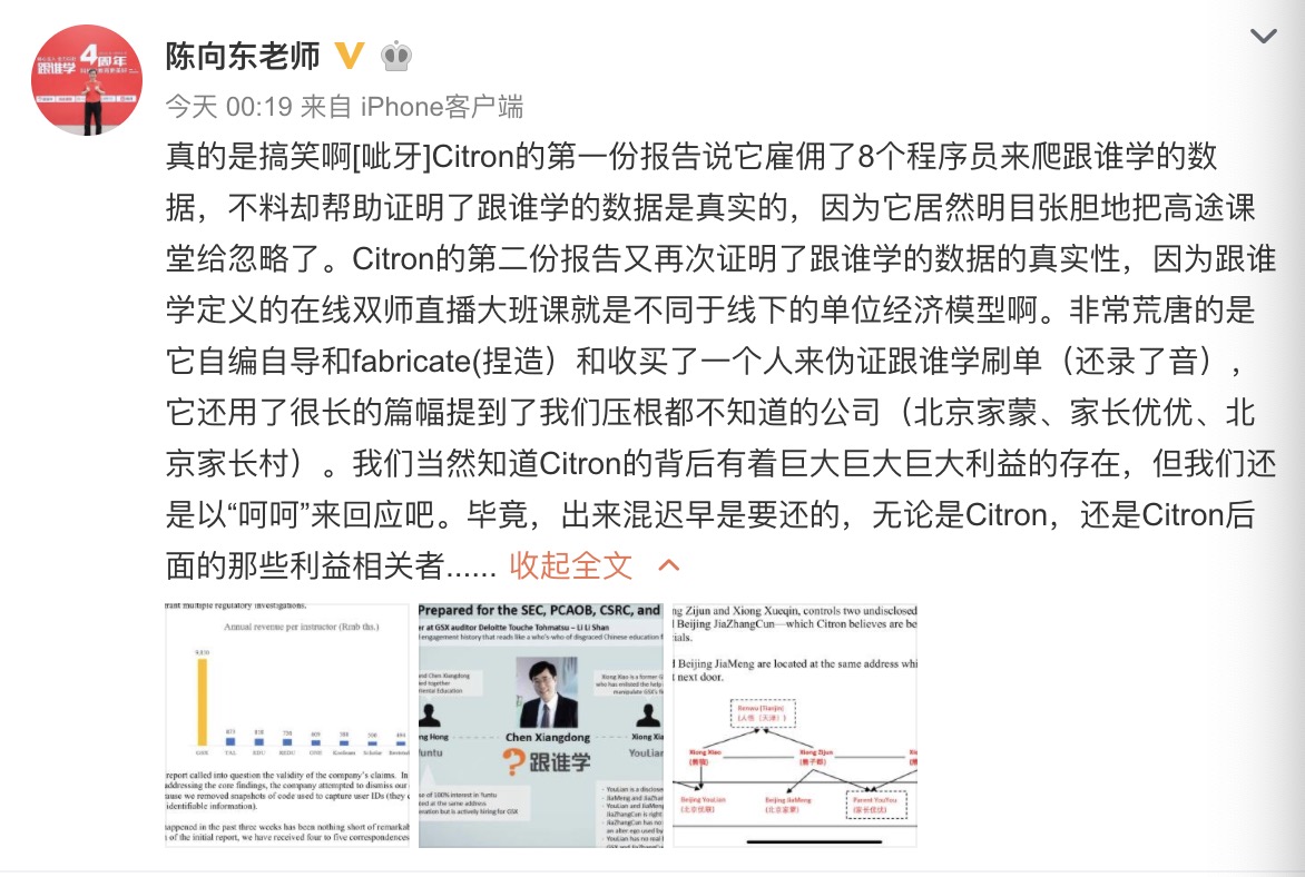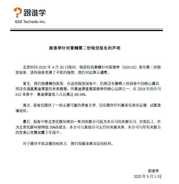 此前做空机构灰熊Grizzly Research曾于2月25日发布报告,称跟谁学将2018年净利润夸大了74.6%,并存在刷单、教师经历造假、关联公司交易等问题。香橼4月14日发布的报告也将重点放在营收虚高、夸大“名师”等问题上。跟谁学随后在4月15日回应做空报告,驳斥其调查方法和结论均不合理。