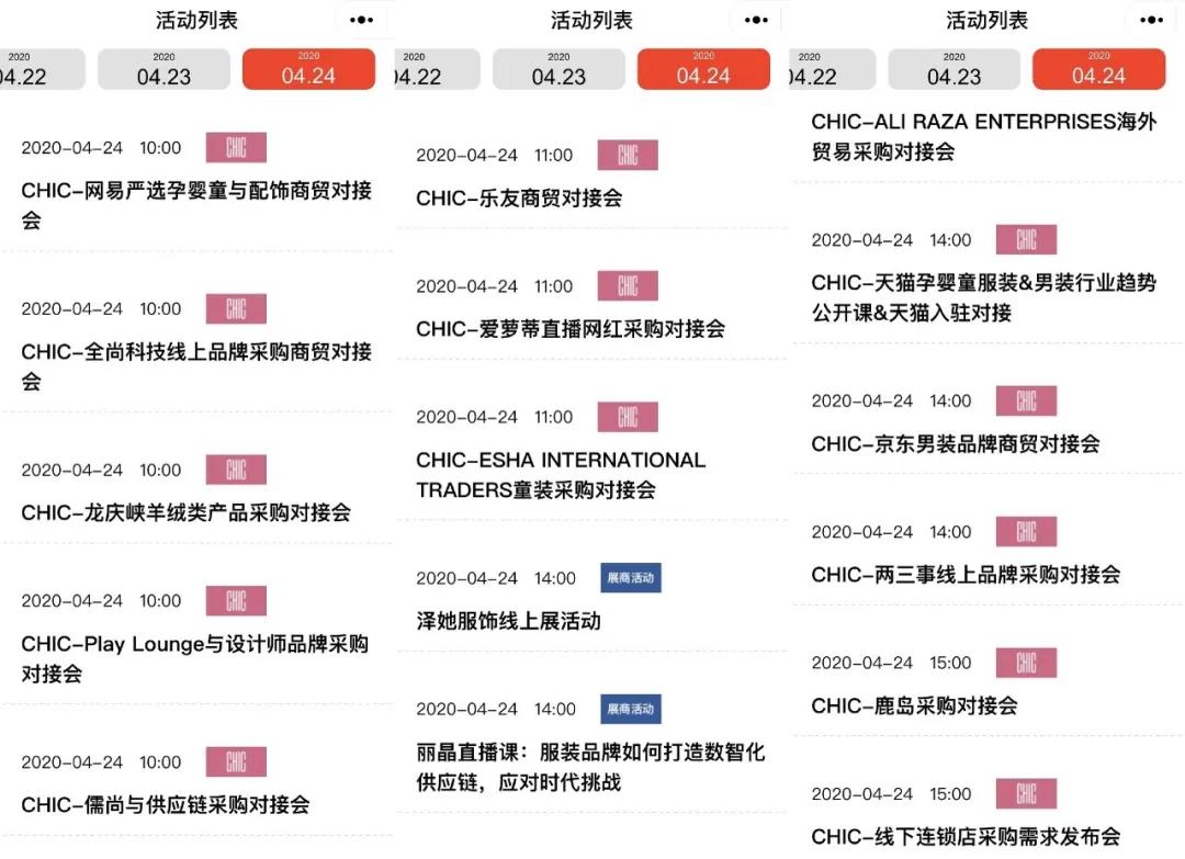 没有了线下的实体展位,CHIC线上展的商贸对接会挪到了腾讯会议、钉钉群、看点直播等多个平台,每天平均会开设30场左右。根据4月24日的这张日程表,对接会的举办主体以采购方为主,而根据主办方发布的公众号文章,网易严选、京东、唯品会等电商大平台和一些百货、购物中心的“会议室”尤为抢手。