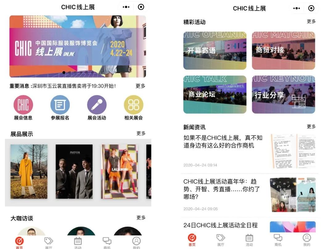 2月底宣布因疫情延期举办的“中国国际服饰服装博览会2020(春季)”(简称CHIC),在4月的22至24日也转移至线上,这场搭建了小程序并延展了“商贸对接”、“商业论坛”和“行业分享”等多个功能区的线上展会背负了一些希望而来。