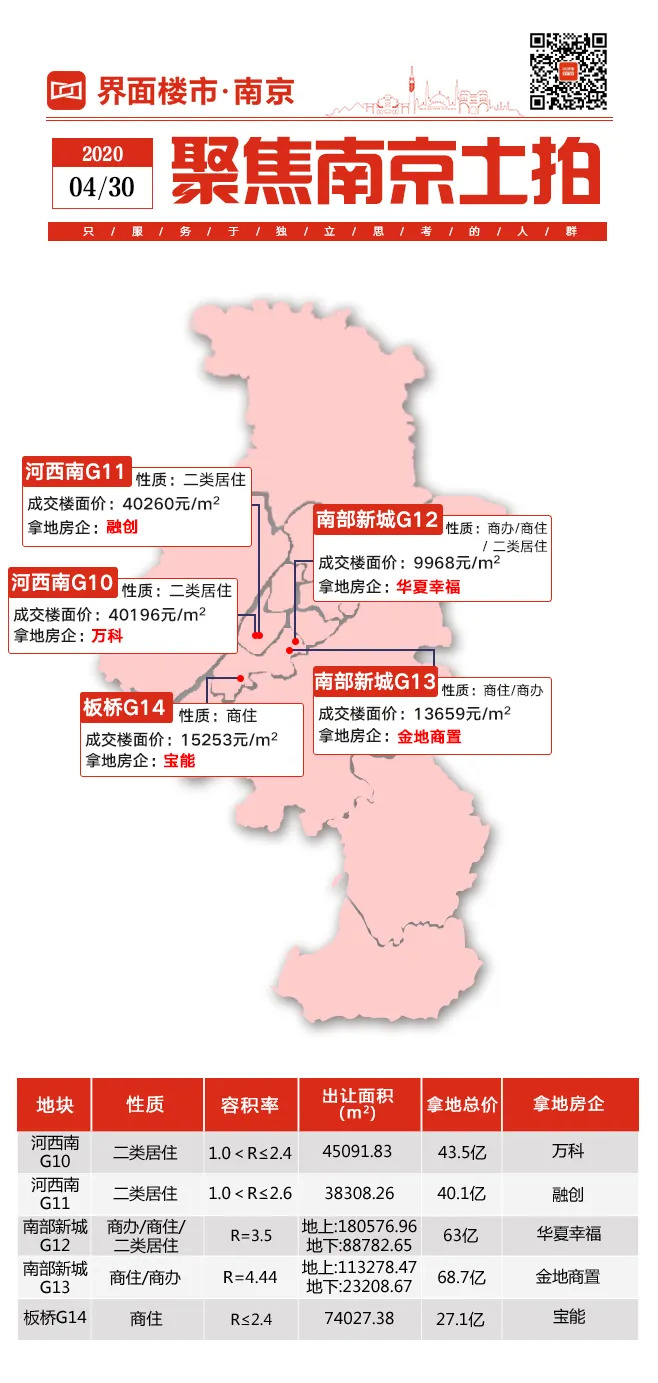 其实早在4月3日的土拍中,南京土拍行情的上涨就已经初见苗头。8家房企报名竞争河西中G02地块,西南G03地块更是有22家房企报名参与。最终,河西中G02地块被高力拍下,楼面地价42398元/㎡,仅次于上海建工的海玥万物项目;河西南G03地块被厦门建发拍下,楼面地价35333元/㎡。