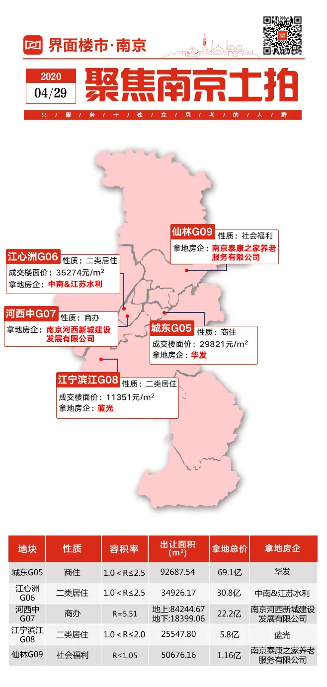 4月29日共成功出让5幅地块,分别位于城中(1幅)、河西(2幅)、江宁(1幅)、仙林(1幅)。总用地面积近31公顷,土拍总价129.06亿元。