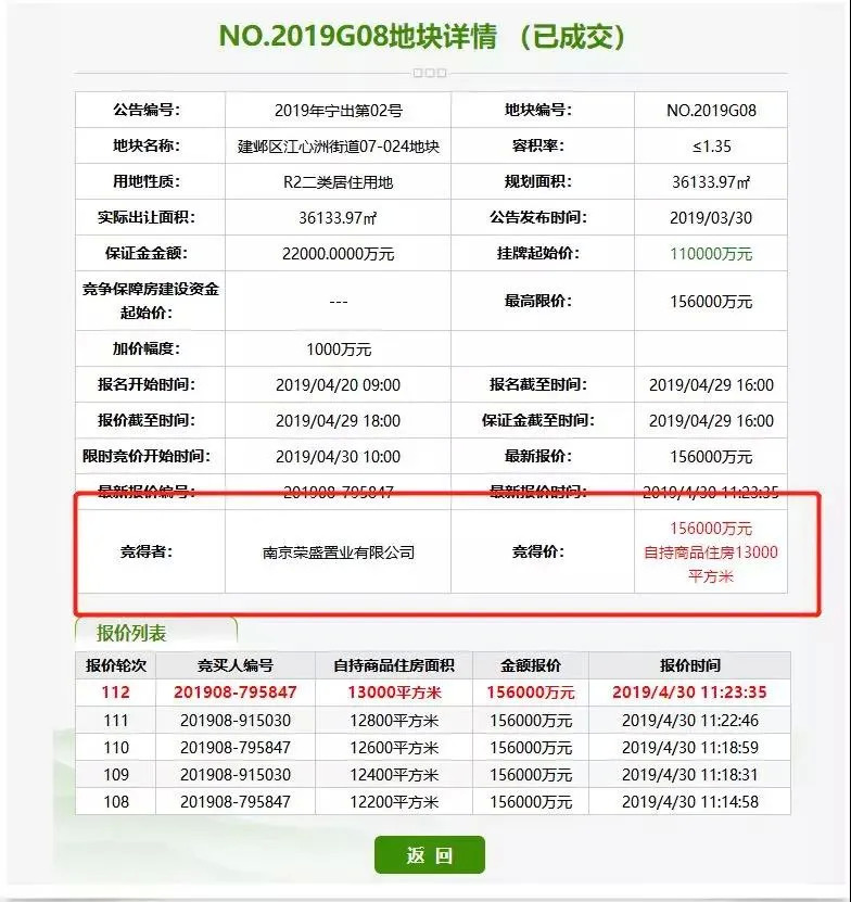 2019年4月30日荣盛拍下的NO.2019G08地块在开拍1分钟就已叫价到20轮,开拍3分钟便达到最高限价,进入自持商品住房报价待确认阶段。最终经过112轮竞标,江心洲G08地块被荣盛以总价15.6亿、成交楼面价31980元/㎡+ 13000㎡自持面积竞得,溢价率达41.82%,自持占比高达26.6%。