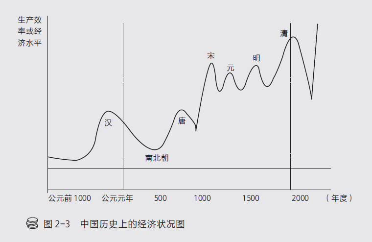 日本的中国史研究学者宫崎市定教授认为,中国经济在汉朝第一次到达顶点以后,在三国时期和南北朝时期经历了漫长的停滞期,到了唐朝和宋朝又有了飞跃式发展。这时的中国人技术力量比西方人发达,拥有西方人渴求的三大产品(丝绸、茶、瓷器),并凭借此优势从西方引入了贵金属。