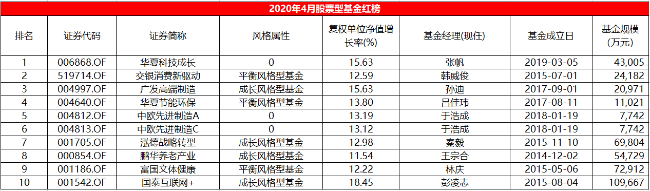 从上表可以看到,经历了三月的调整后,科技类基金回归。其中成立于今年3月5日的次新基金华夏科技成长综合得分第一,4月收益15.63%,基金经理为张帆。华夏基金旗下另一只产品华夏节能环保亦上榜。