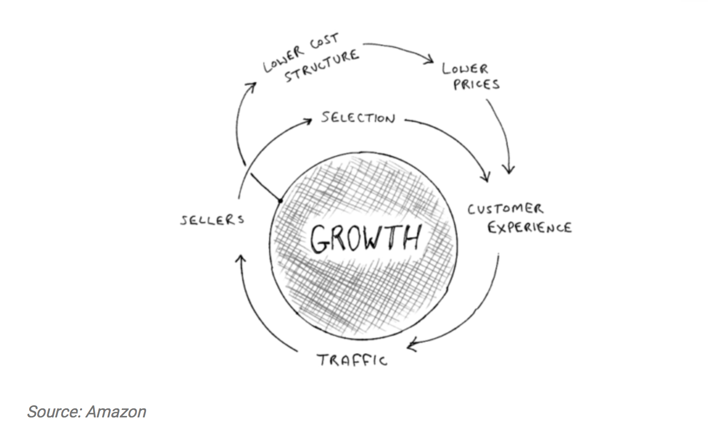 亚马逊的客户体验越好,网站的流量越多,吸引到平台的卖家越多,并且可以提供的商品选择就越好。这带来了增长,但也带来了更好的客户体验。